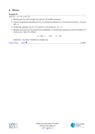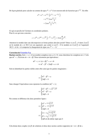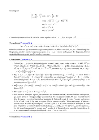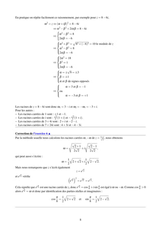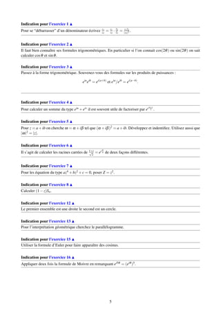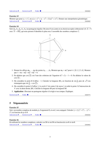 Le document présente une série d'exercices sur les nombres complexes, incluant leur forme cartésienne et polaire, le calcul de racines carrées, et la résolution d'équations du second degré. Il aborde également des concepts liés à la géométrie et à la trigonométrie, ainsi que des propriétés algébriques des nombres complexes. Chaque exercice est accompagné d'indications et de corrections sous forme de vidéos pour aider à la compréhension.