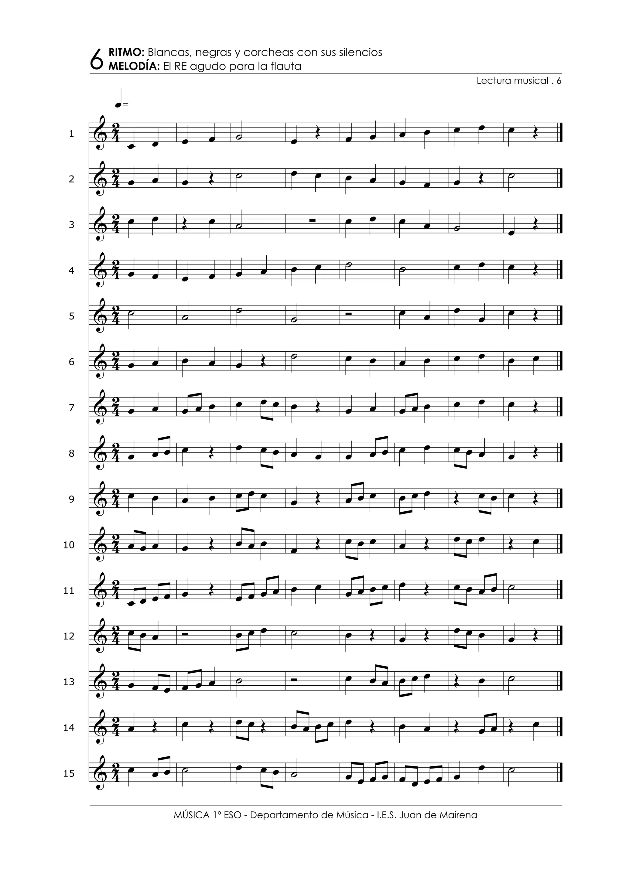 Le document présente une série de notations musicales pour flûte, comprenant différentes rythmiques et mélodies. Il met l'accent sur des éléments de lecture musicale comme les notes aiguës et les silences. Ce contenu est destiné aux élèves du département de musique d'un établissement éducatif.
