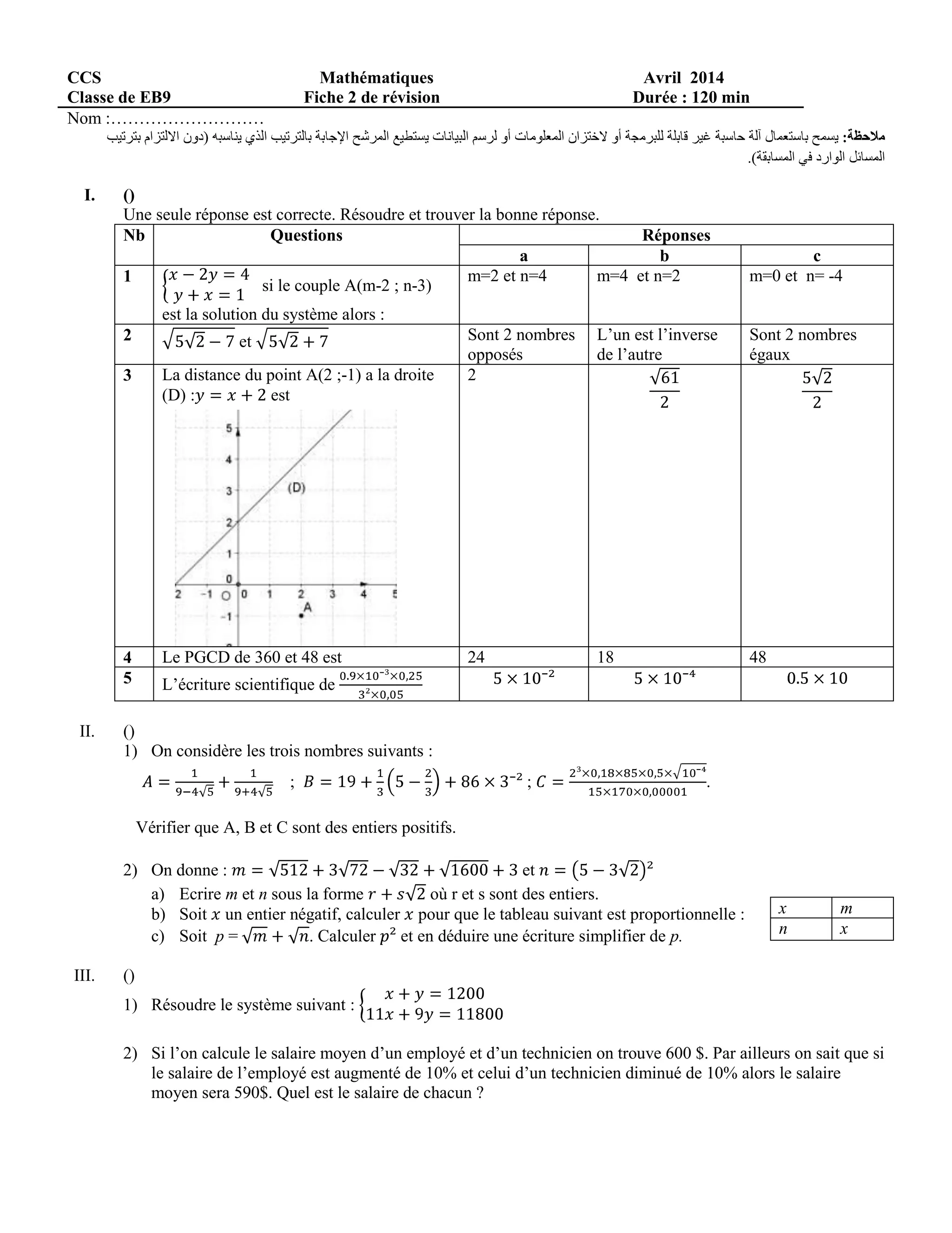 Le document est une fiche de révision de mathématiques pour une classe de eb9, comprenant divers exercices sur les systèmes d'équations, le calcul de distances, le PGCD, et la géométrie dans un repère orthonormé. Il aborde également le développement, la factorisation d'expressions algébriques, et le calcul de salaires avec des pourcentages. Enfin, il considère des propriétés des cercles et des tangentes dans des constructions géométriques.