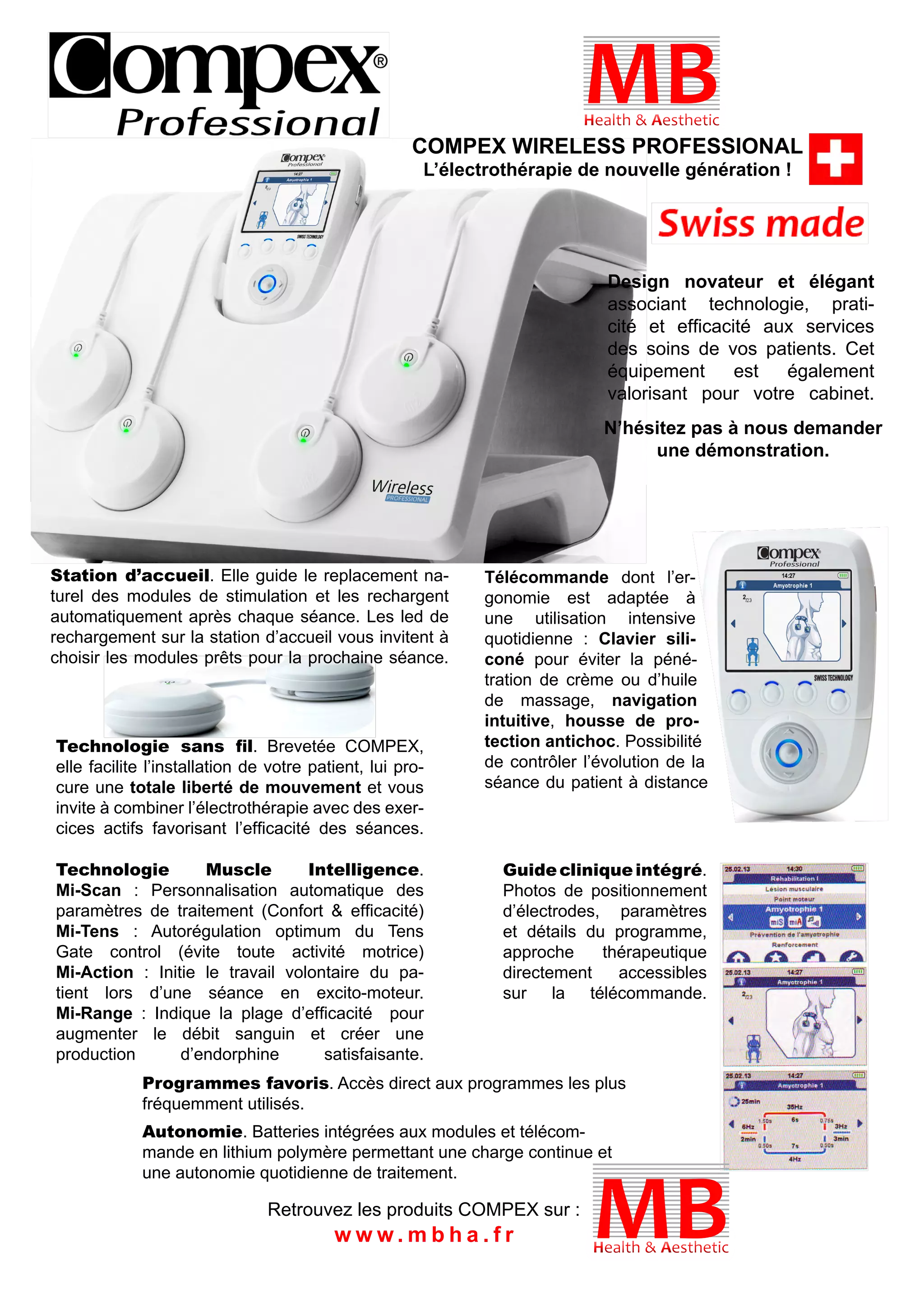 Le Compex Wireless Professional est un appareil d'électrothérapie de nouvelle génération conçu pour améliorer les soins des patients avec une technologie sans fil et des fonctionnalités comme la télécommande ergonomique et la personnalisation automatique des traitements. Il offre une gamme de programmes de réhabilitation pour diverses applications, y compris la gestion de la douleur et le renforcement musculaire, tout en garantissant une autonomie quotidienne grâce à ses batteries lithium polymère. La station d'accueil permet un rechargement automatique des modules après chaque séance, facilitant ainsi leur utilisation.