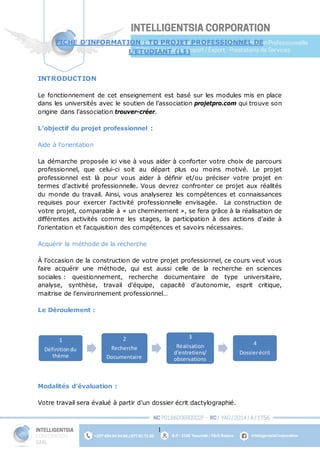 Ce document décrit le fonctionnement du projet professionnel pour les étudiants de première année, visant à les aider à définir et affiner leur parcours professionnel. Les étudiants doivent réaliser des recherches documentaires, mener des entretiens avec des professionnels et rédiger un dossier écrit pour évaluer leur progression. Il présente également les différentes étapes du projet, incluant la définition du thème, la documentation, les entretiens, et la rédaction du dossier final.