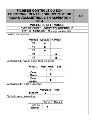 Ce document est une fiche de contrôle destinée à vérifier le bon fonctionnement d'un groupe moteur avec une pompe volumétrique en aspiration. Il détaille les valeurs attendues, les positions des vannes, le niveau d'eau dans les cuves, l'état de l'arrêt d'urgence, ainsi que le choix du sens de rotation. Il permet de s'assurer que tous les paramètres nécessaires au bon fonctionnement soient respectés.