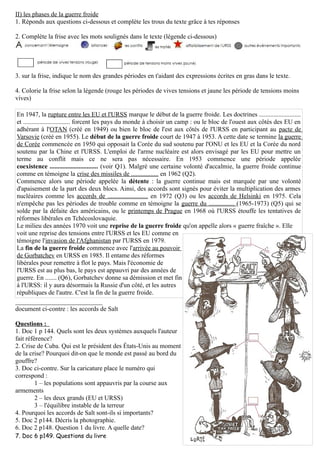 La guerre froide se caractérise par une division mondiale en deux blocs, l'Ouest dirigé par les États-Unis et l'Est par l'URSS, avec des conflits périphériques tels que la guerre de Corée. Les tensions se sont intensifiées entre 1947 et 1953, suivies par des périodes de coexistence et de détente, mais les conflits ont persisté jusqu'à l'effondrement de l'URSS en 1991 sous Gorbatchev. Les accords internationaux, tels que les accords de SALT, visaient à réduire les armements nucléaires et à stabiliser les relations entre les deux superpuissances.