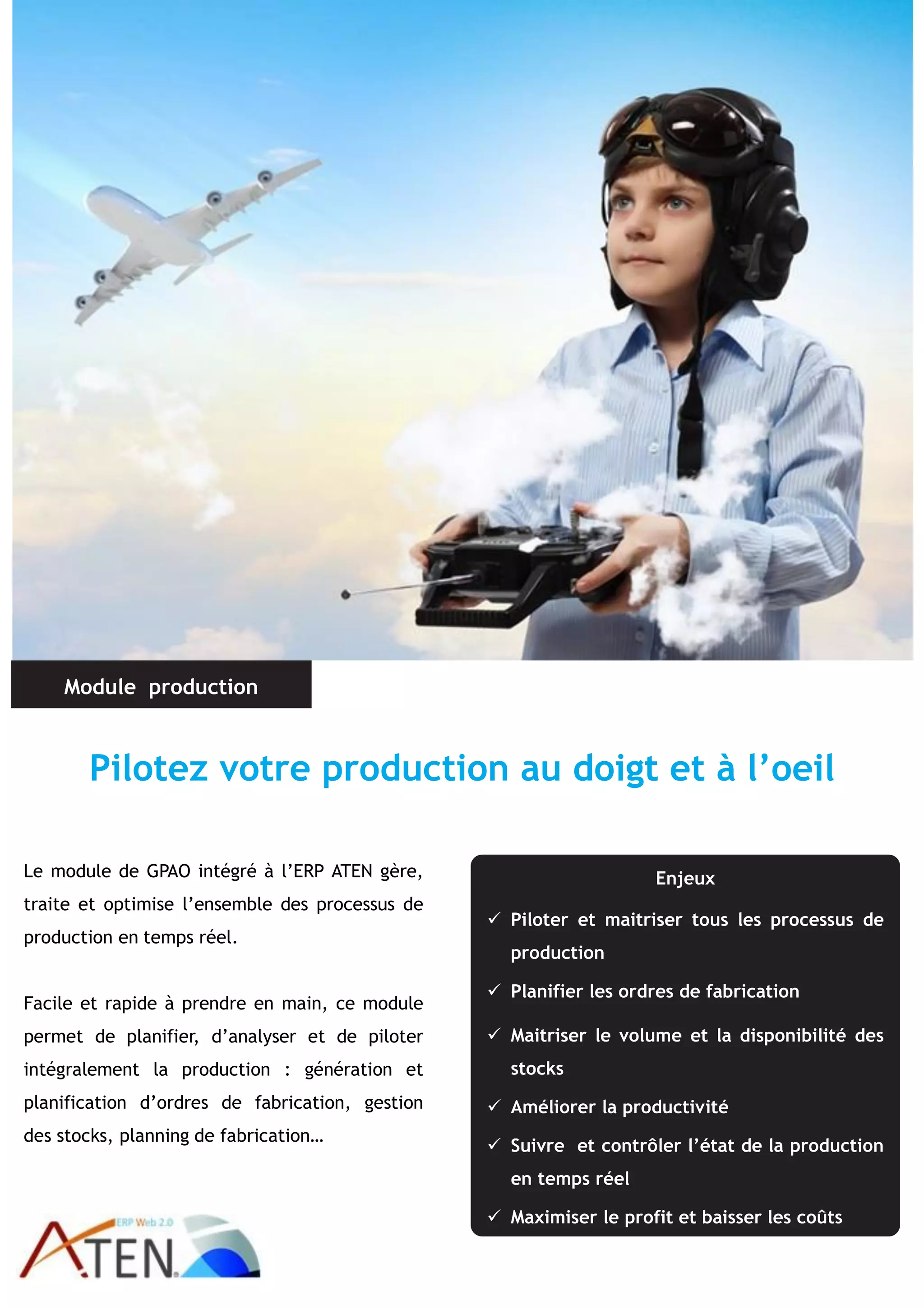 Le module de GPAO intégré à l'ERP Aten permet de gérer, traiter et optimiser en temps réel les processus de production, incluant la planification et le suivi des ordres de fabrication et des stocks. Imagina International, éditeur et intégrateur de cette solution depuis 2003, offre un accompagnement à travers une équipe d'experts pour des projets ambitieux. Les fonctionnalités incluent la planification, l'analyse des coûts de production et un outil de business intelligence intégré.