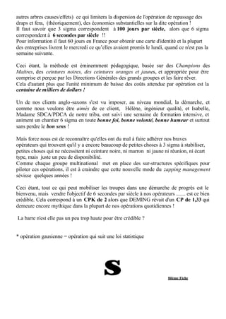 Le document traite de la méthode 6 sigma, un outil de gestion de la qualité qui décompose les opérations non gaussiennes pour réduire leur dispersion et améliorer leur efficacité. Il souligne les défis d'adhésion des opérateurs à cette approche, qui pourtant promet des économies substantielles. Malgré ses avantages pédagogiques, la crédibilité de l'objectif de 6 secondes par siècle est mise en question face aux réalités opérationnelles.