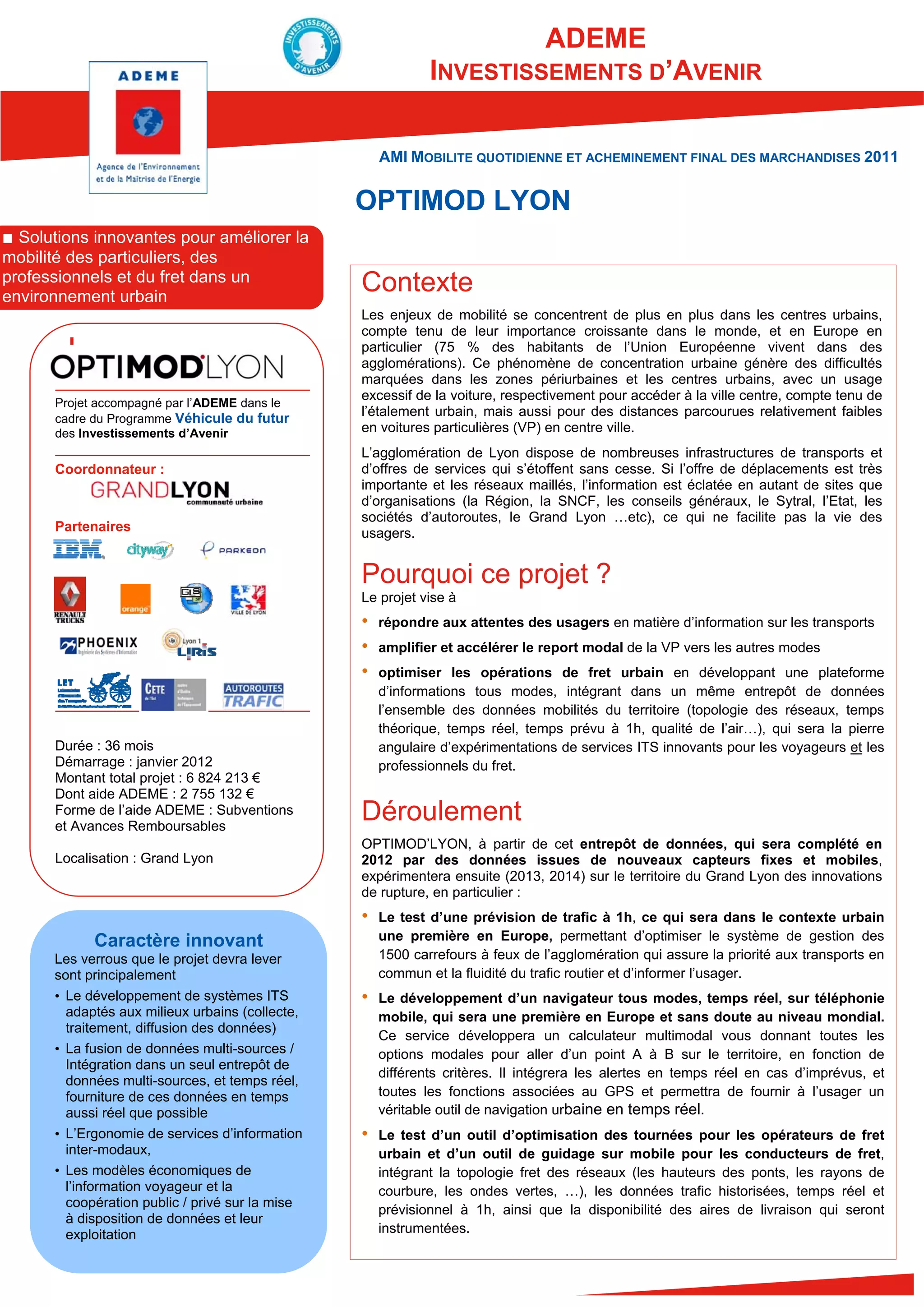 Le projet Optimod'Lyon vise à améliorer la mobilité urbaine à Lyon en intégrant une plateforme d'informations multimodales pour les usagers et les opérateurs de fret, dans le cadre des investissements d'avenir de l'ADEME. Avec un budget de 6,93 millions d'euros, il vise un report modal de 8% d'ici 2020, économisant 200 000 tonnes de CO2 annuellement et facilitant la coopération public-privé. Les résultats attendus incluent des services d'information performants, une meilleure qualité de l'air, et des retombées économiques significatives pour le développement des entreprises partenaires.