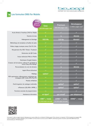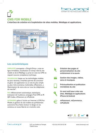 Le document présente un CMS pour la création de sites mobiles et d'applications, permettant une conception facile grâce à une interface 'drag & drop' sans compétences techniques nécessaires. Il propose des fonctionnalités de prévisualisation, de publication et d'optimisation pour divers dispositifs, ainsi que plusieurs formules tarifaires et options d'hébergement. Les utilisateurs peuvent personnaliser leur site et accéder à des outils de marketing, comme le référencement automatique et les statistiques d'audience.