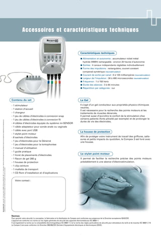 Le document présente le stimulateur Compex 3, un appareil d'électrostimulation avancé destiné aux professionnels de santé, intégrant des fonctions pour la gestion des patients, l'historique des traitements et la création de programmes personnalisés. Il utilise la technologie Muscle Intelligence pour adapter la stimulation à chaque patient et offre des options de synchronisation avec un ordinateur pour un suivi détaillé. En plus de ses capacités, le stimulateur est conforme aux normes de sécurité européennes et inclut divers accessoires pour un usage optimal.