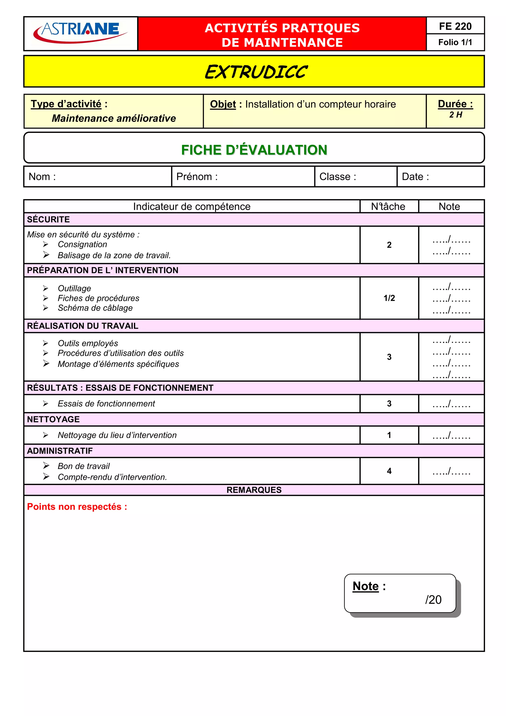 Le document décrit les activités pratiques liées à la maintenance d'un système d'extrusion, notamment l'installation d'un compteur horaire sur une durée de 2 heures. Il inclut une fiche d'évaluation avec des indicateurs de compétence, des étapes de sécurité, de préparation et de réalisation du travail, ainsi qu'un retour sur l'intervention. Des observations sur le respect des procédures sont également mentionnées.