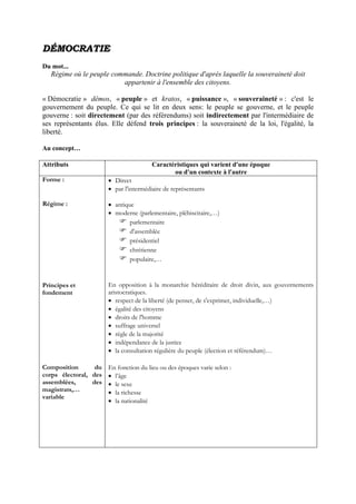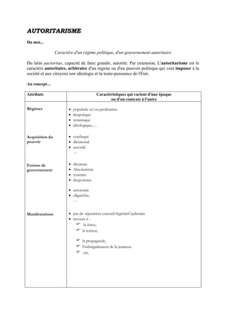 Le document analyse différents concepts politiques et sociaux, tels que l'autoritarisme, la démocratie, la migration, et le socialisme, en explorant leurs caractéristiques, évolutions historiques, et impacts sur la société. Chaque terme est décomposé en attribuant des définitions et en contextualisant ses applications à travers différentes époques et régimes. Le texte met également en avant les mouvements et idéologies qui ont influencé la structure sociopolitique moderne.