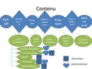 Le document présente un projet d'innovation basé sur le design thinking, abordant les étapes clés d'exploration, de tri d'idées et de mise en production des prototypes. Il détaille des outils comme la carte d'empathie, l'analyse SWOT et les méthodologies des '5 pourquoi' pour comprendre les motivations des clients et définir des solutions adaptées. Ce processus collaboratif permet d'identifier les points de frustration des clients, de hiérarchiser les idées et d'assurer le suivi des prototypes pour évaluer leur succès.