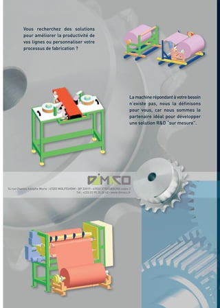 Le document décrit divers équipements et machines pour l'industrie, notamment des systèmes d'inspection et de découpe, des machines de rebobinage et des équipements de complexage. Chaque machine est accompagnée de ses caractéristiques techniques, telles que la vitesse de ligne, le diamètre des bobines, et les méthodes de découpe. Il met également en avant la possibilité de personnalisation des machines pour répondre aux besoins spécifiques des clients.