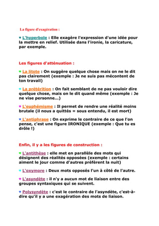 Les figures de style sont des procédés linguistiques qui créent des effets de sens ou de sonorité. Elles incluent des figures de répétition, d'analogie, d'exagération, d'atténuation et de construction, chacune ayant des spécificités comme l'anaphore, la métaphore, ou l'antithèse. Ces figures enrichissent le langage en jouant sur les significations et les formes des mots.