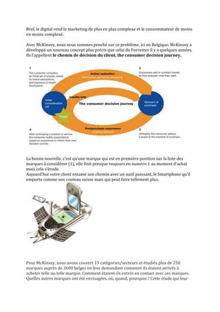 Le document discute de l'évolution du marketing à l'ère digitale, mettant en avant une étude de McKinsey sur le parcours décisionnel des consommateurs belges. Il souligne l'importance des points de contact digitaux, qui influencent de plus en plus les décisions d'achat, tout en notant que la présence des marques dans ces canaux est cruciale pour le succès commercial. La recherche de McKinsey révèle également que les marques qui offrent de meilleures expériences digitales obtiennent de meilleures ventes, tout en mettant en évidence la nécessité d'une stratégie de marketing digital efficace.