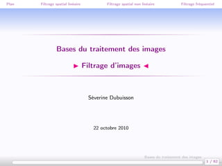 Ce document traite des bases du traitement des images, en se concentrant sur différentes méthodes de filtrage, y compris le filtrage spatial linéaire et non linéaire, ainsi que le filtrage fréquentiel. Il aborde des concepts clés tels que la réduction du bruit, la convolution, et différents types de filtres comme le filtre médian et le lissage gaussien. Les applications et exemples illustrent comment ces techniques peuvent être utilisées pour améliorer la qualité des images.