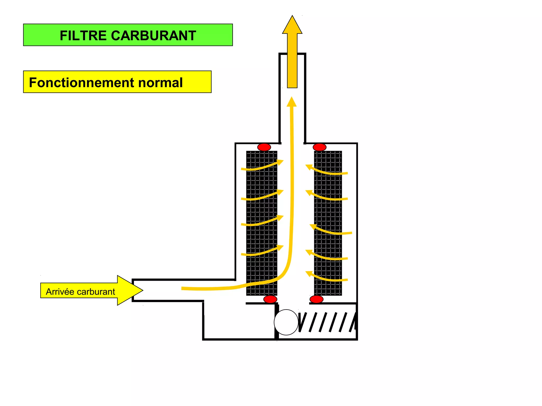 Le document décrit le fonctionnement normal d'un filtre à carburant et les problèmes de pré-colmatage qui déclenchent une alarme sonore. En cas de colmatage, le clapet by-pass s'ouvre et le témoin de colmatage s'allume, indiquant que le carburant n'est plus filtré. Cela souligne l'importance du bon fonctionnement du filtre à carburant.