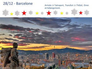 Le document décrit un programme de fin d'année à Barcelone, incluant des visites, des dîners et des hébergements du 28 décembre au 1er janvier. Les participants bénéficieront d'une excursion à Figueres et Girona, d'une visite de la ville de Barcelone, ainsi que d'un dîner de réveillon avec animations. Le prix par personne est de 497,00 € en base double, incluant l'hébergement, les repas et les transferts, mais excluant les pourboires et certaines entrées.