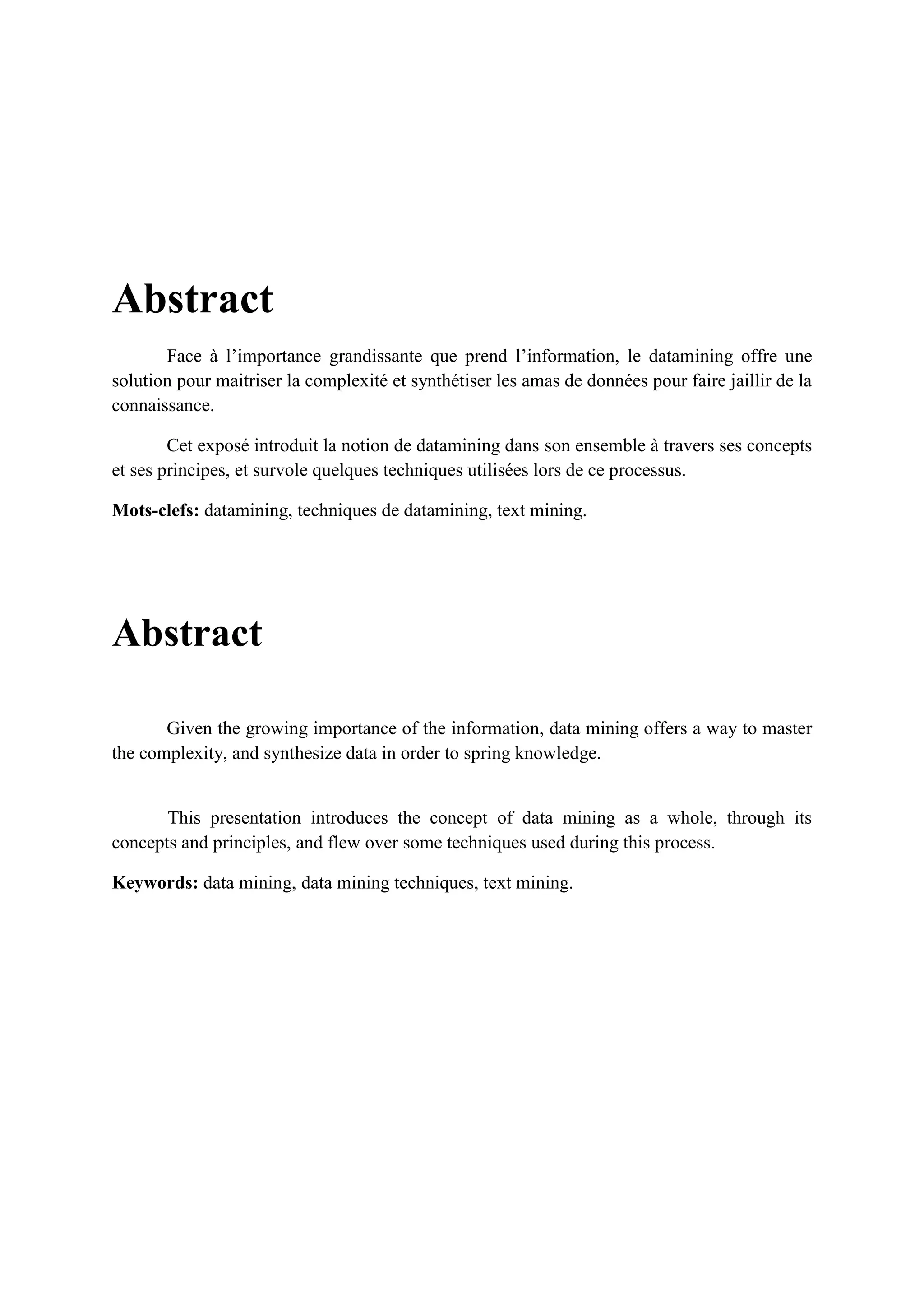 Le document présente le datamining comme une technique essentielle pour synthétiser de grandes quantités de données et en extraire des connaissances utiles. Il décrit le processus de datamining, les étapes clés, ainsi que diverses techniques et applications dans des domaines variés comme le marketing, la finance et la santé. En outre, le texte aborde les limites et les perspectives futures du datamining.