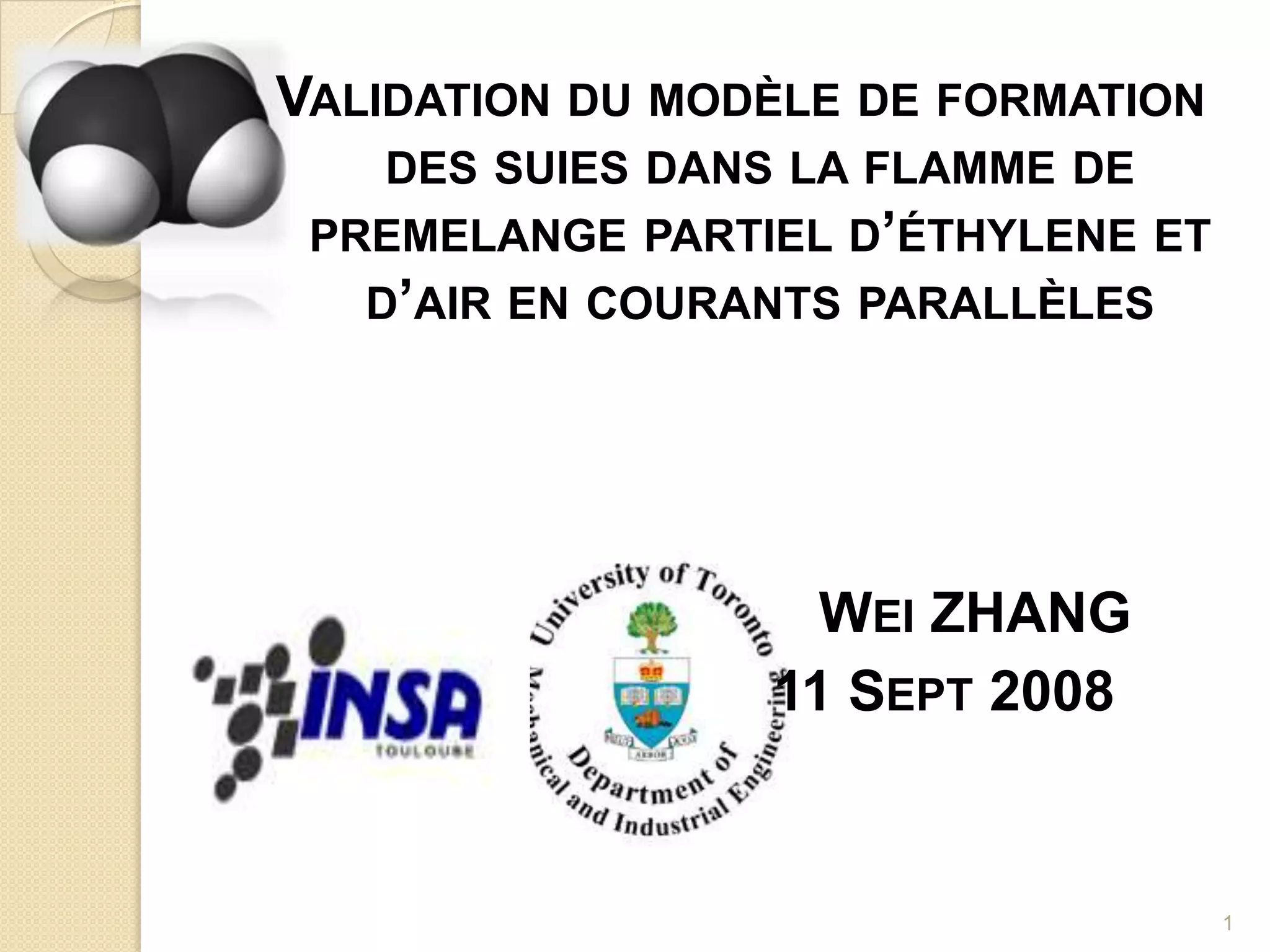 Le document aborde la validation d'un modèle de formation des particules de suie dans une flamme de pré-mélange partiel d'éthylène et d'air. Il présente les objectifs du groupe, la méthodologie employée, et les résultats expérimentaux liés à l'agrégation des particules de suie. Ce modèle vise à améliorer la compréhension des mécanismes de formation des particules et à concevoir des dispositifs pour leur élimination.
