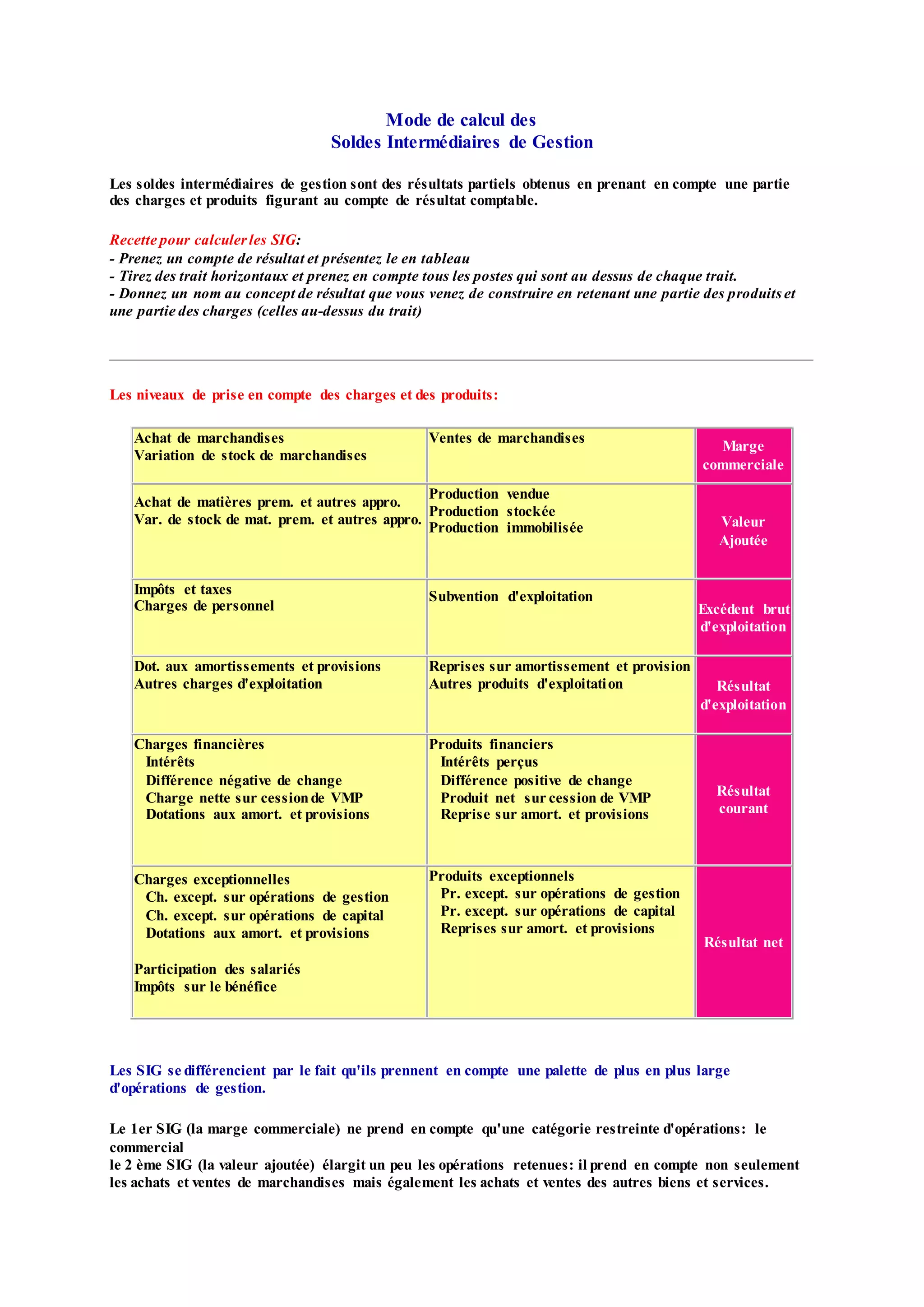 Le document explique le calcul des soldes intermédiaires de gestion (SIG), qui sont des résultats partiels du compte de résultat comptable, couvrant divers niveaux d'opérations de gestion. Il décrit les différents SIG, tels que la marge commerciale, la valeur ajoutée, et l'excédent brut d'exploitation, en mettant en lumière leurs implications sur la rentabilité et la liquidité d'une entreprise. Enfin, il aborde la construction d'un bilan financier visant à évaluer la solvabilité et la liquidité d'une entreprise sous l'optique du prêteur.