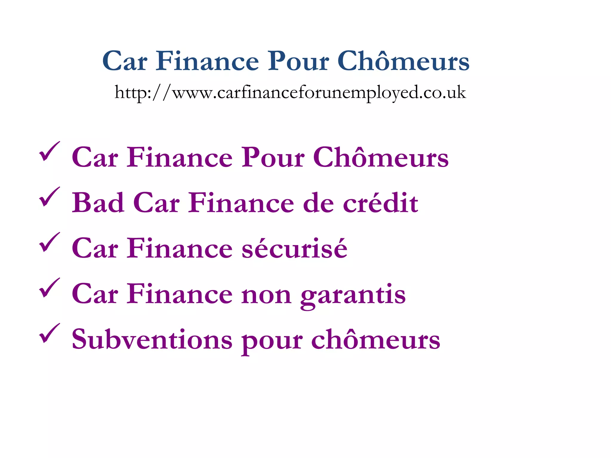 Le document traite des options de financement automobile pour les chômeurs, y compris des financements garantis et non garantis, adaptés aux personnes confrontées à des problèmes de crédit. Des subventions sont également mentionnées pour aider à l'achat de véhicules d'occasion ou à la réparation automobile, bien que leur obtention soit souvent difficile. Les emprunteurs peuvent obtenir des prêts variant de 1 000 à 25 000 livres, selon le type de financement choisi.
