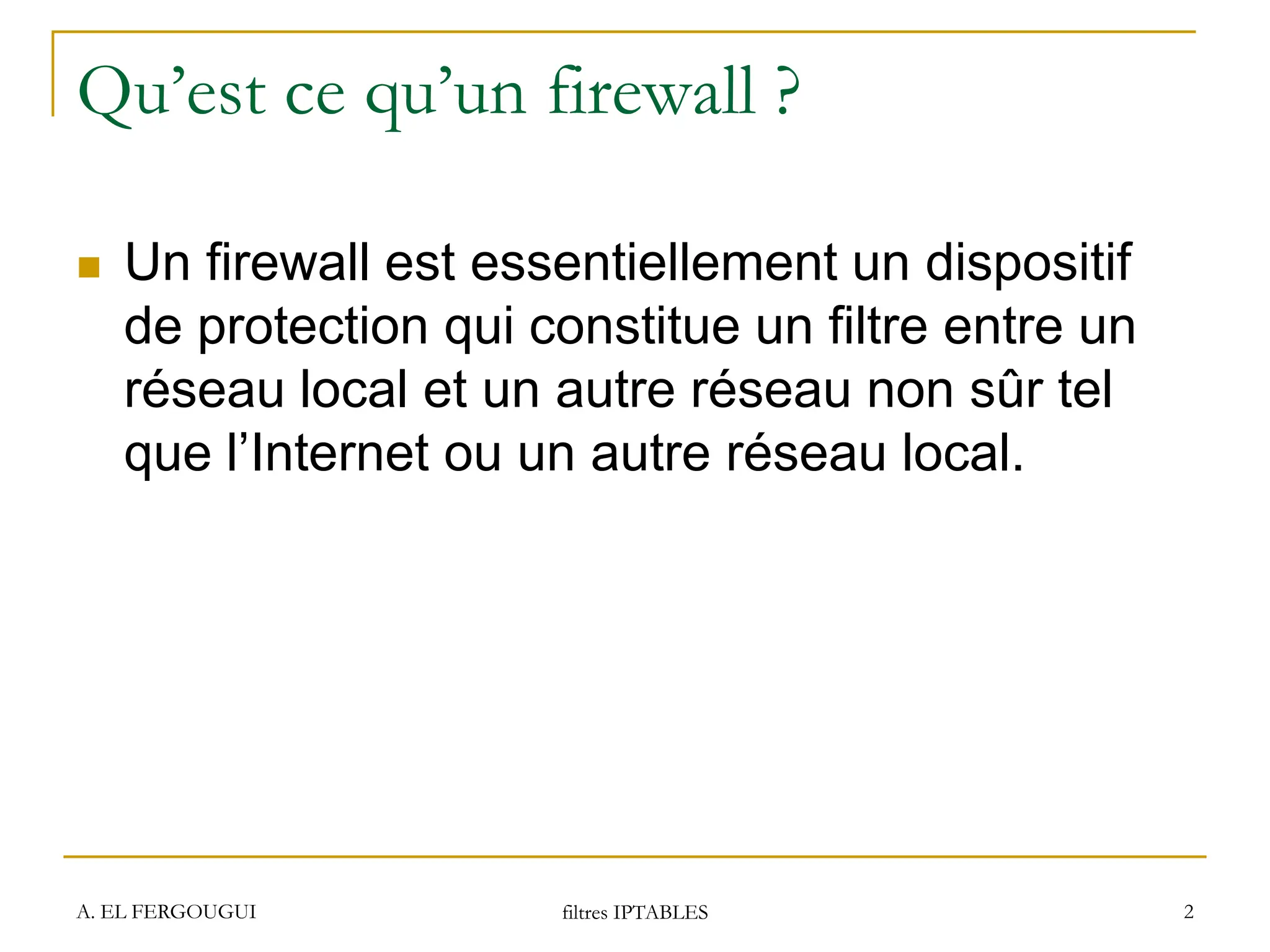 Un firewall est un dispositif de sécurité qui filtre le trafic entre un réseau local et un réseau externe, visant à protéger les hôtes et serveurs des menaces. Il fonctionne selon des principes tels que le moindre privilège et la défense en profondeur, avec différents niveaux de filtrage comme le filtrage de paquets et le filtrage applicatif. Des configurations spécifiques telles que le routage avec NAT et les zones DMZ permettent une gestion avancée de la sécurité réseau.