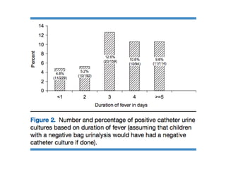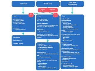 Le document aborde la prise en charge de la fièvre chez les enfants de 0 à 36 mois, en mettant l'accent sur l'importance de l'examen physique et en contestation de l'utilisation systématique des marqueurs biologiques comme la FSC ou la CRP. Il souligne une diminution des taux de bactériémie en raison des vaccinations récentes et propose une approche simplifiée pour les jeunes enfants fébriles sans foyer. Un nouveau guide clinique est suggéré, mettant l'accent sur une stratégie moins intrusive et plus sûre.