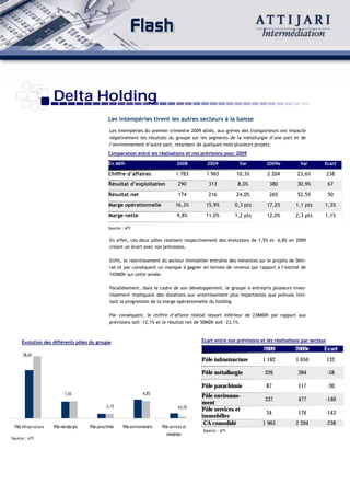Delta Holding affiche une croissance significative avec un chiffre d'affaires en hausse de 10,3% pour atteindre 1,965 milliard de dirhams, principalement grâce à son pôle infrastructure qui contribue à 60% de ses revenus. Malgré des résultats impactés par des intempéries et des grèves, le groupe anticipe une croissance continue de 10% en 2010 et 2011, soutenue par une augmentation des investissements publics. La recommandation d'achat est maintenue avec un objectif de cours fixé à 110 dirhams basée sur des fondamentaux solides.