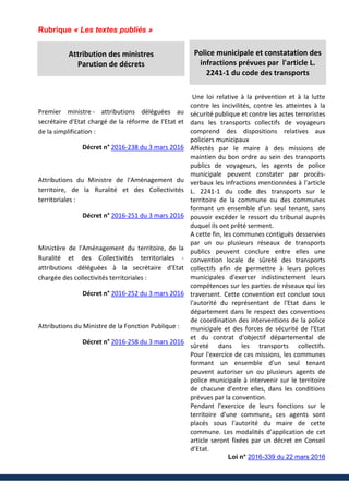 Le document traite de plusieurs décrets et lois, notamment le décret portant statut particulier des cadres territoriaux de santé paramédicaux et la revalorisation de leur cadre d'emplois, ainsi que la création d'un fonds pour la formation des élus locaux. Il aborde également des jurisprudences concernant les sanctions disciplinaires et la discrimination envers des fonctionnaires en raison de leur état de santé ou de leur grossesse. Ces textes et décisions soulignent les évolutions législatives et les droits des agents publics en matière de statut et de conditions de travail.