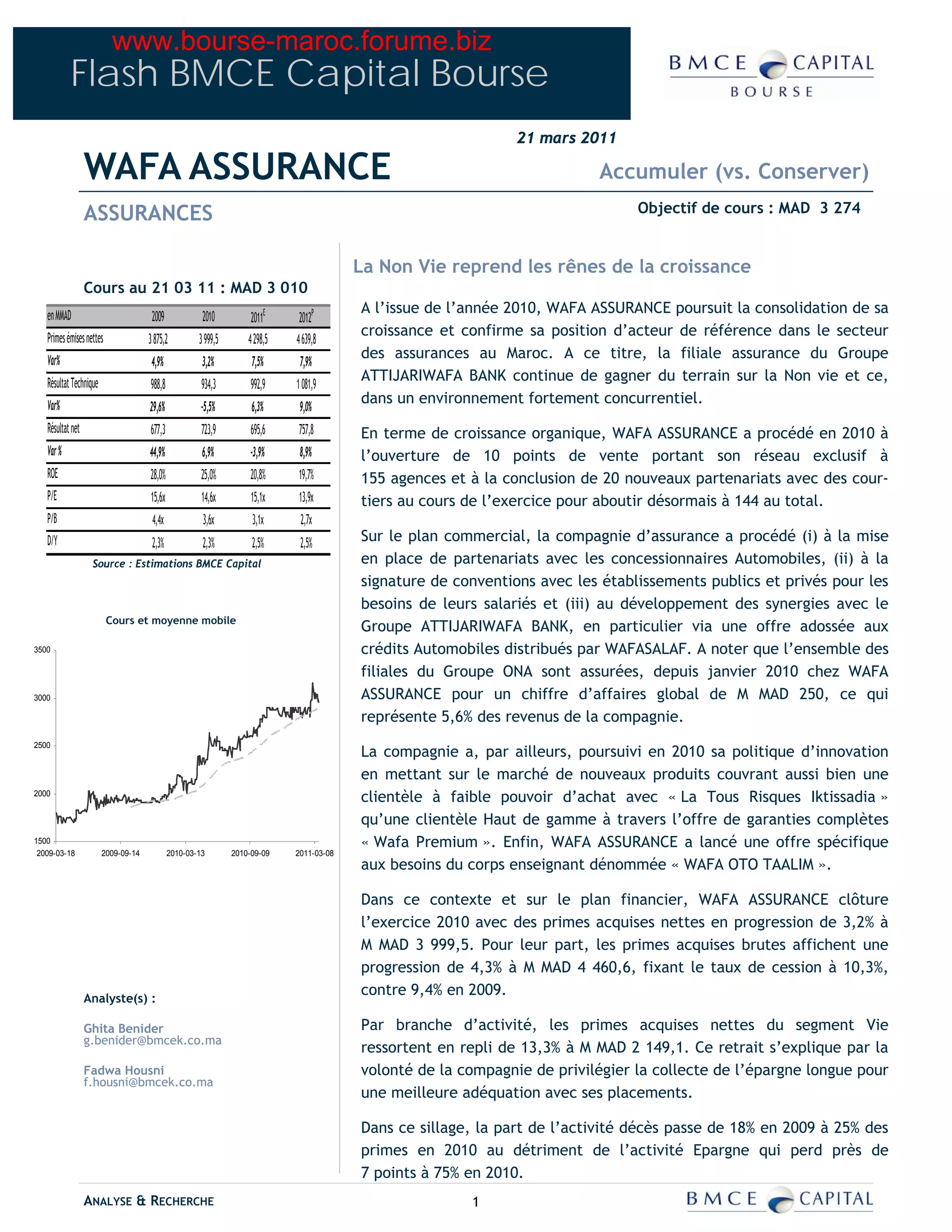 Wafa Assurance a consolidé sa position sur le marché marocain des assurances avec une augmentation de 3,2% de ses primes acquises nettes en 2010, malgré une contraction dans le segment vie. La compagnie a également élargi son réseau en ouvrant de nouveaux points de vente et en établissant des partenariats stratégiques, tout en maintenant un focus sur l'innovation de produits pour divers segments de clients. Les perspectives s'annoncent positives avec des ambitions de croissance externe en Afrique et une stratégie visant à renforcer ses synergies avec le groupe Attijariwafa Bank.