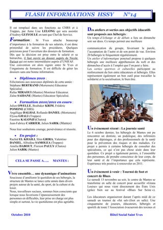 Le document présente des nouvelles et événements récents au sein de l'Hôtel Social Saint Yves, y compris des changements de personnel, la création de services et groupes de travail dédiés à l'amélioration de l'hébergement, et des initiatives pour renforcer la formation des employés. Il évoque également des projets centrés sur la santé, le sport et la culture pour les bénéficiaires, tout en soulignant l'importance de favoriser un quotidien agréable pour les hébergés. Enfin, des événements à venir sont annoncés, tels qu'un tournoi de foot et un concert de blues.