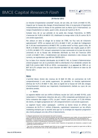 Maroc Telecom a enregistré une baisse de 2,5% de son chiffre d'affaires consolidé en 2011, atteignant 30,8 milliards MAD, en raison d'une forte concurrence et d'une réduction des prix, bien que les filiales africaines aient montré une croissance de 8,9%. Les prévisions pour 2012 indiquent une contraction continue des marges, avec une stratégie de baisse des prix et de diversification des offres pour faire face à la concurrence croissante. Le conseil d'administration envisage une distribution de dividende avec un pay-out de 100% malgré une diminution significative des résultats financiers.