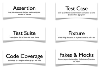 Le document traite des tests unitaires et du développement piloté par les tests (TDD) avec Flex et ActionScript. Il décrit différents types de tests, notamment les tests unitaires, d'intégration et fonctionnels, et souligne l'importance de l'isolation des composants pour un test efficace. Le document fournit également des ressources et des conseils pratiques pour la mise en œuvre de TDD dans le développement d'applications.