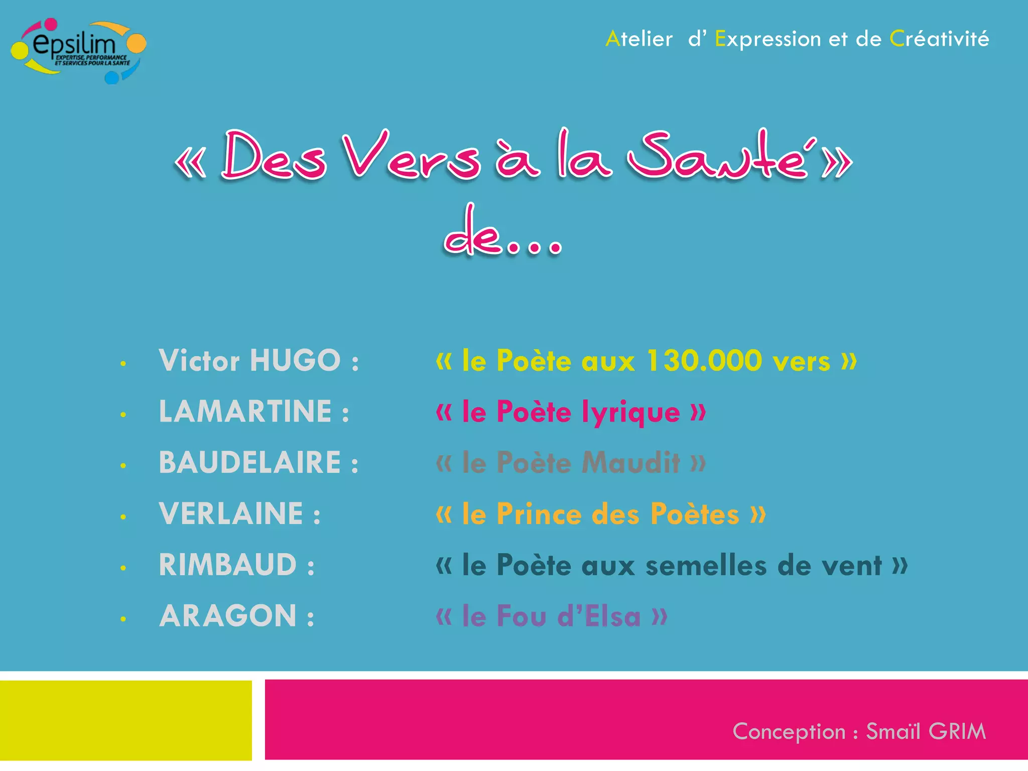 Le document présente un atelier d'expression et de créativité centré sur la poésie française, mettant en avant des poètes comme Victor Hugo, Lamartine, Baudelaire, Verlaine, et Rimbaud. Il propose des activités ludiques pour explorer les techniques de versification et encourager la création poétique. Ces poètes sont décrits à travers leurs contributions littéraires et leurs caractéristiques distinctives.