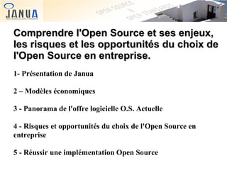 Le document présente une analyse approfondie de l'open source en entreprise, abordant ses enjeux, risques et opportunités. Il décrit les services offerts par Janua, les modèles économiques associés à l'open source, ainsi qu'un panorama des logiciels disponibles. Enfin, il explore les critères pour réussir l'implémentation de solutions open source, incluant des méthodes d'évaluation spécifiques.