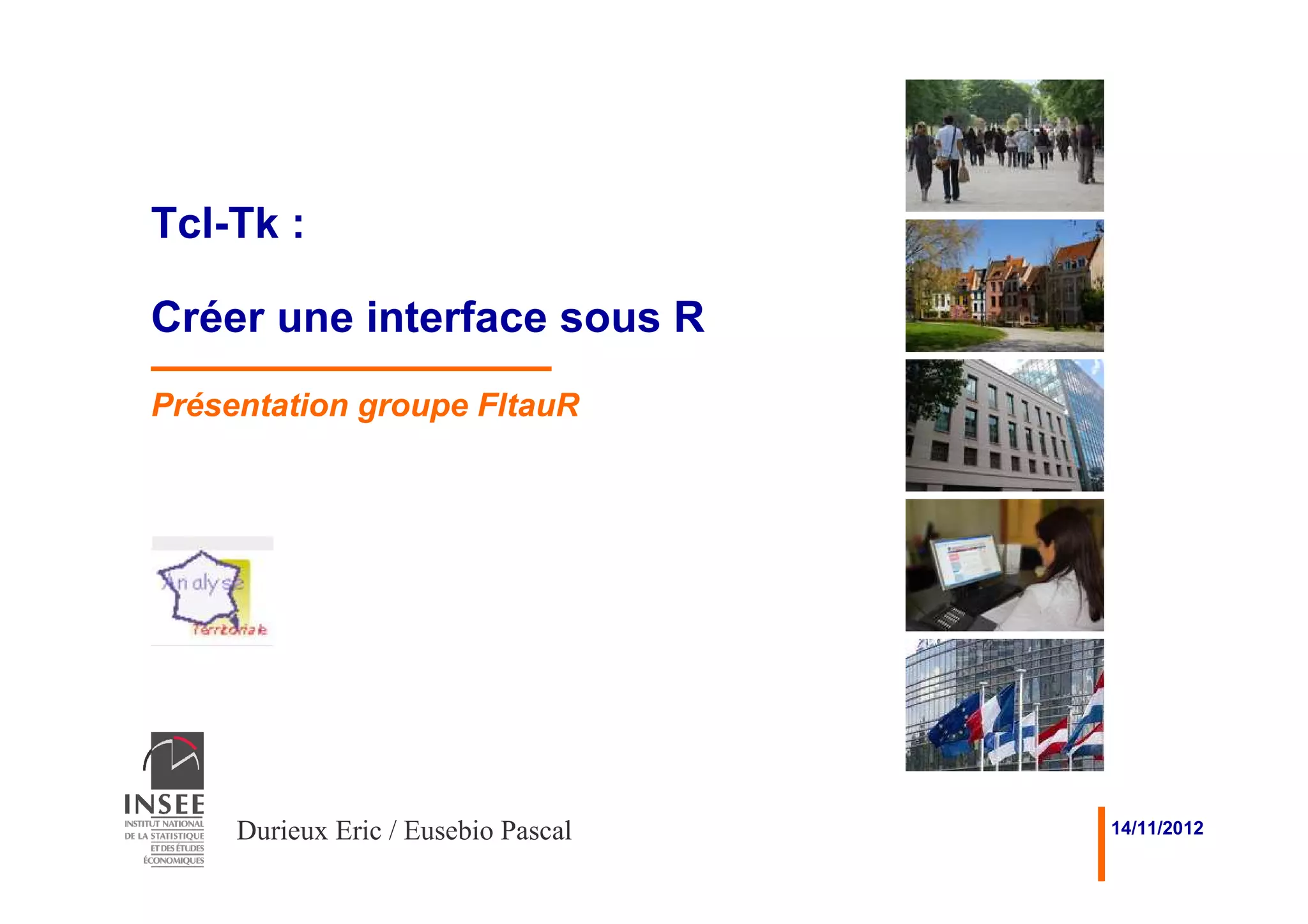 Le document présente l'utilisation de tcl-tk pour créer des interfaces graphiques sous R, visant à faciliter l'accès à des fonctionnalités pour des utilisateurs n'ayant pas de connaissances en programmation. Il décrit des éléments clés tels que la création de fenêtres, de frames, l'affichage de tableaux et de graphiques, ainsi que la gestion des menus. Enfin, le document aborde le lancement d'applications R avec une interface graphique sans nécessiter l'ouverture préalable de R.
