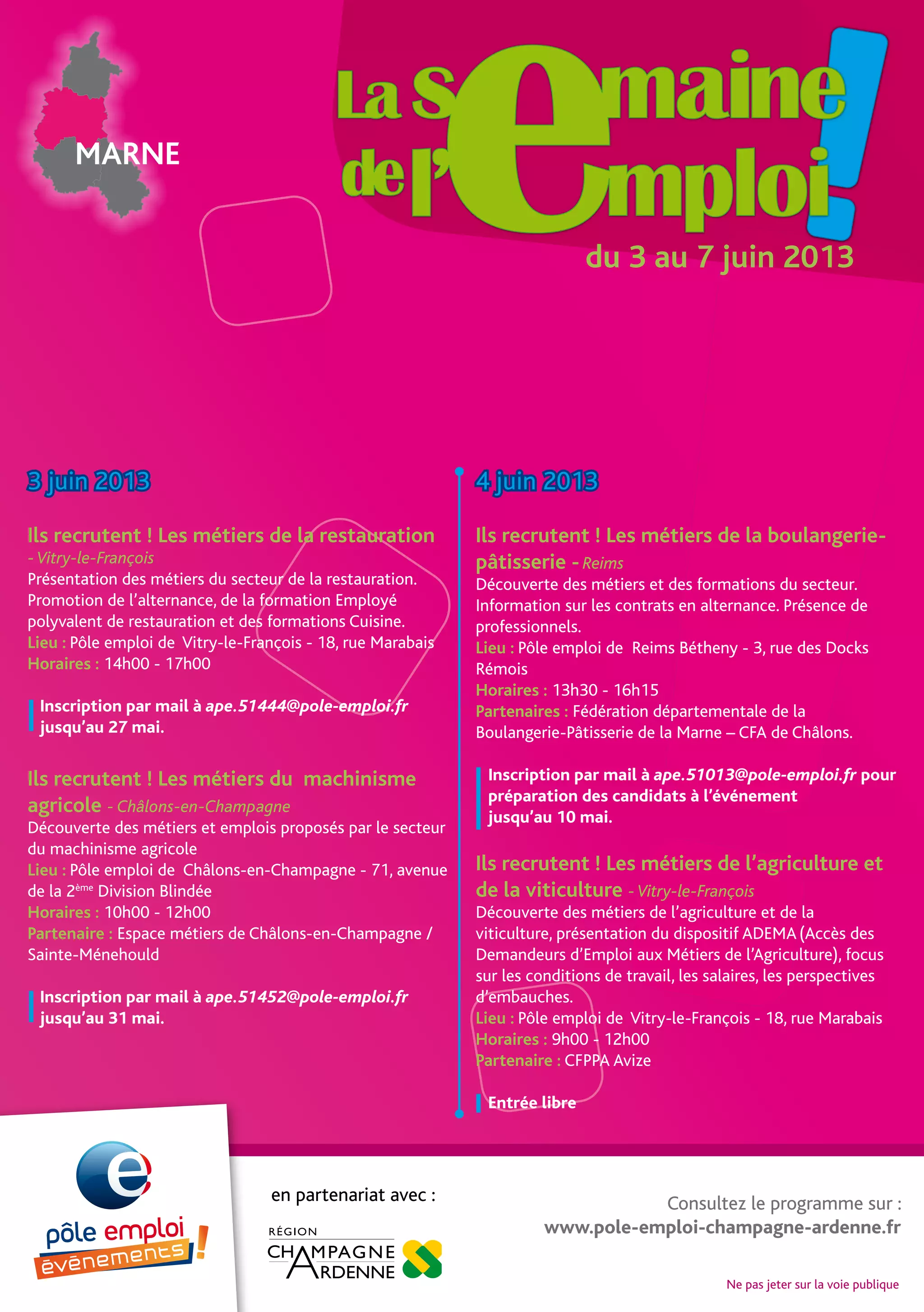 Du 3 au 7 juin 2013, divers événements de recrutement et de présentation des métiers se tiendront à travers plusieurs villes de la Marne, incluant des secteurs tels que la restauration, l'agriculture, et les services à la personne. Les participants pourront s'inscrire par mail et bénéficier d'informations sur les métiers, les formations et les contrats en alternance. Les événements sont organisés par Pôle emploi et ses partenaires, avec une entrée généralement libre.