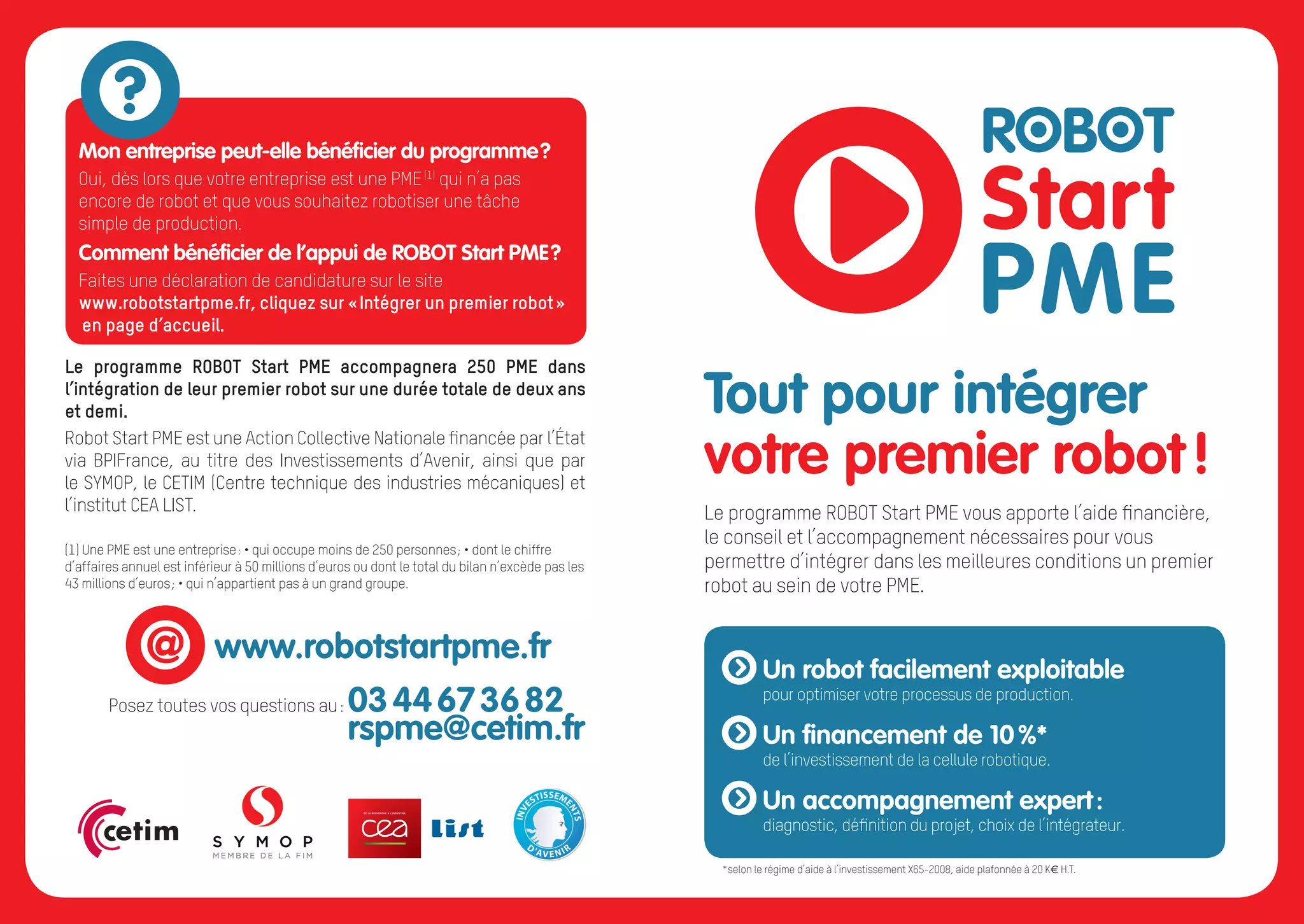 Le programme Robot Start PME offre une aide financière et un accompagnement aux petites et moyennes entreprises souhaitant intégrer leur premier robot afin d'optimiser leur production. Les entreprises éligibles peuvent bénéficier d'un financement plafonné et d'un accompagnement expert à travers un processus en plusieurs étapes. Cette initiative vise à renforcer la compétitivité des PME en améliorant leur productivité tout en maintenant les emplois en France.