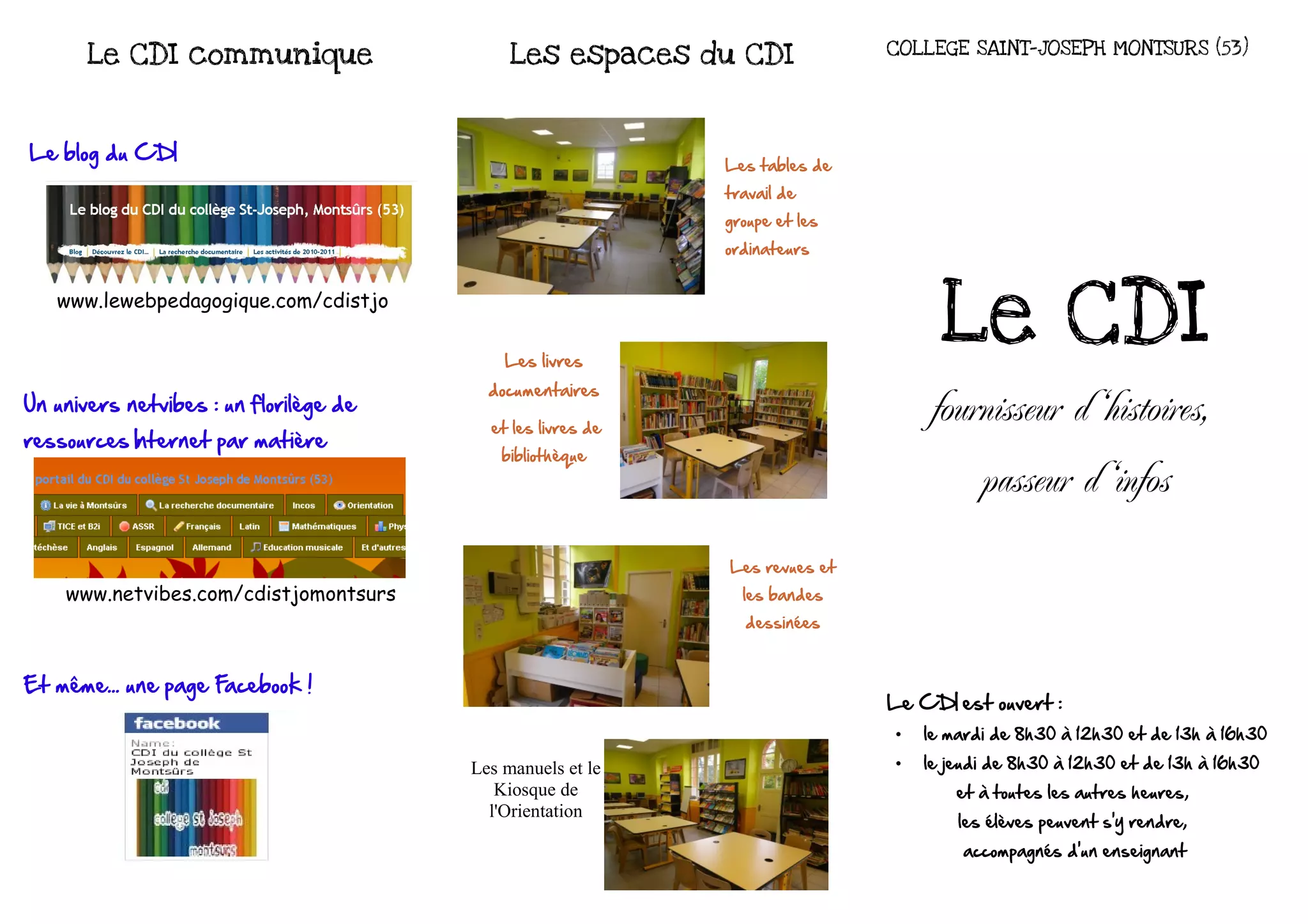 Le document présente les activités et ressources du Centre de Documentation et d'Information (CDI) du Collège Saint-Joseph de Montsûrs, y compris des ateliers de lecture, des abonnements à des revues, et des projets de classes presse pour enseigner aux élèves la recherche documentaire. Le CDI est ouvert plusieurs jours par semaine et propose divers espaces pour le travail en groupe, ainsi que des documents variés allant des livres aux bandes dessinées. Enfin, il met en avant des initiatives comme le défi lecture pour les élèves de 6ème et des projets inter-collèges.