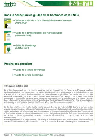 Le guide de la signature électronique, élaboré par la Fédération Nationale des Tiers de Confiance (FNTC), vise à informer sur les enjeux et les pratiques de la dématérialisation des documents. Il présente les bénéfices et les exigences juridiques liés à l'utilisation de la signature électronique dans divers domaines, tout en abordant des questions pratiques pour sa mise en œuvre. Le document s'adresse aux décideurs et aux professionnels souhaitant intégrer cette technologie pour améliorer la productivité et la confiance dans les échanges numériques.