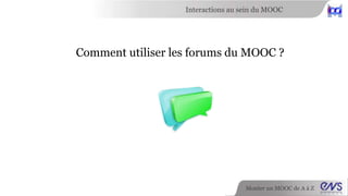 Le document explique comment utiliser les forums dans un MOOC, en centralisant les fils de discussion pour les questions d'organisation et techniques, et encourageant les participants à s'y engager. Il met en avant l'importance des interactions, telles que rencontrer d'autres participants et discuter du contenu du cours, tout en signalant la nécessité de respecter les règles de conduite. Les concepteurs ont également une communauté dédiée pour les commentaires et les échanges.