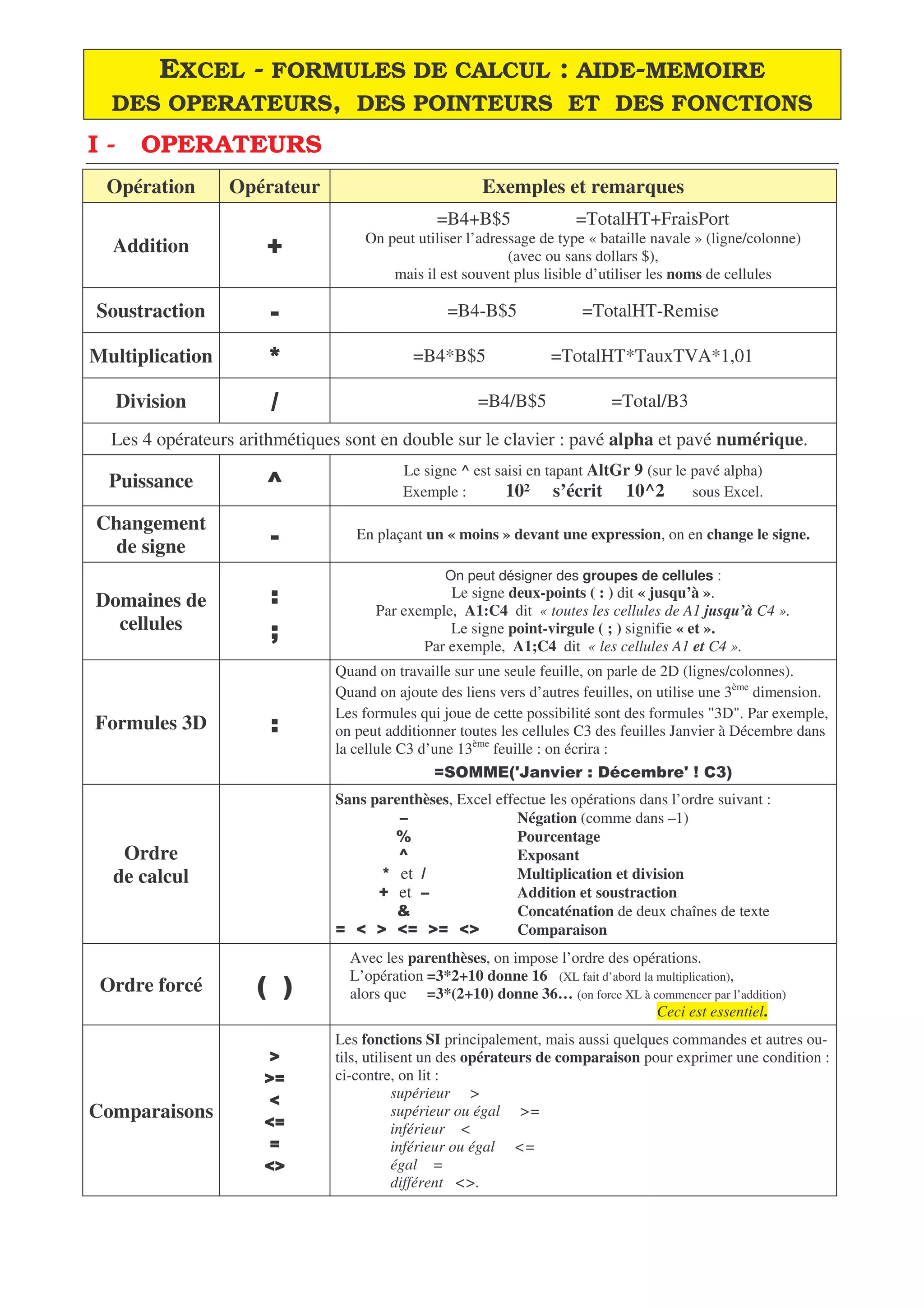 Ce document sert d'aide-mémoire sur l'utilisation des formules, opérateurs et fonctions dans Excel. Il décrit différents types d'opérateurs arithmétiques, les méthodes de référence de cellules, ainsi que des exemples de formules et de fonctions communes pour effectuer des calculs et manipuler des données. L'accent est mis sur l'importance de l'utilisation des signes de dollar pour figer des références et l'ordre des opérations dans les formules.