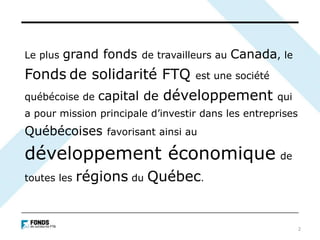 Le Fonds de solidarité FTQ est le plus grand fonds de travailleurs au Canada, investissant dans les entreprises québécoises pour soutenir le développement économique. Avec un actif net de 8,2 milliards $ et un rendement de 8,8% sur 12 mois, il a contribué à la création de près de 583 000 emplois. Depuis sa création, le fonds a investi plus de 9 milliards $ dans diverses régions et secteurs d'activité au Québec.