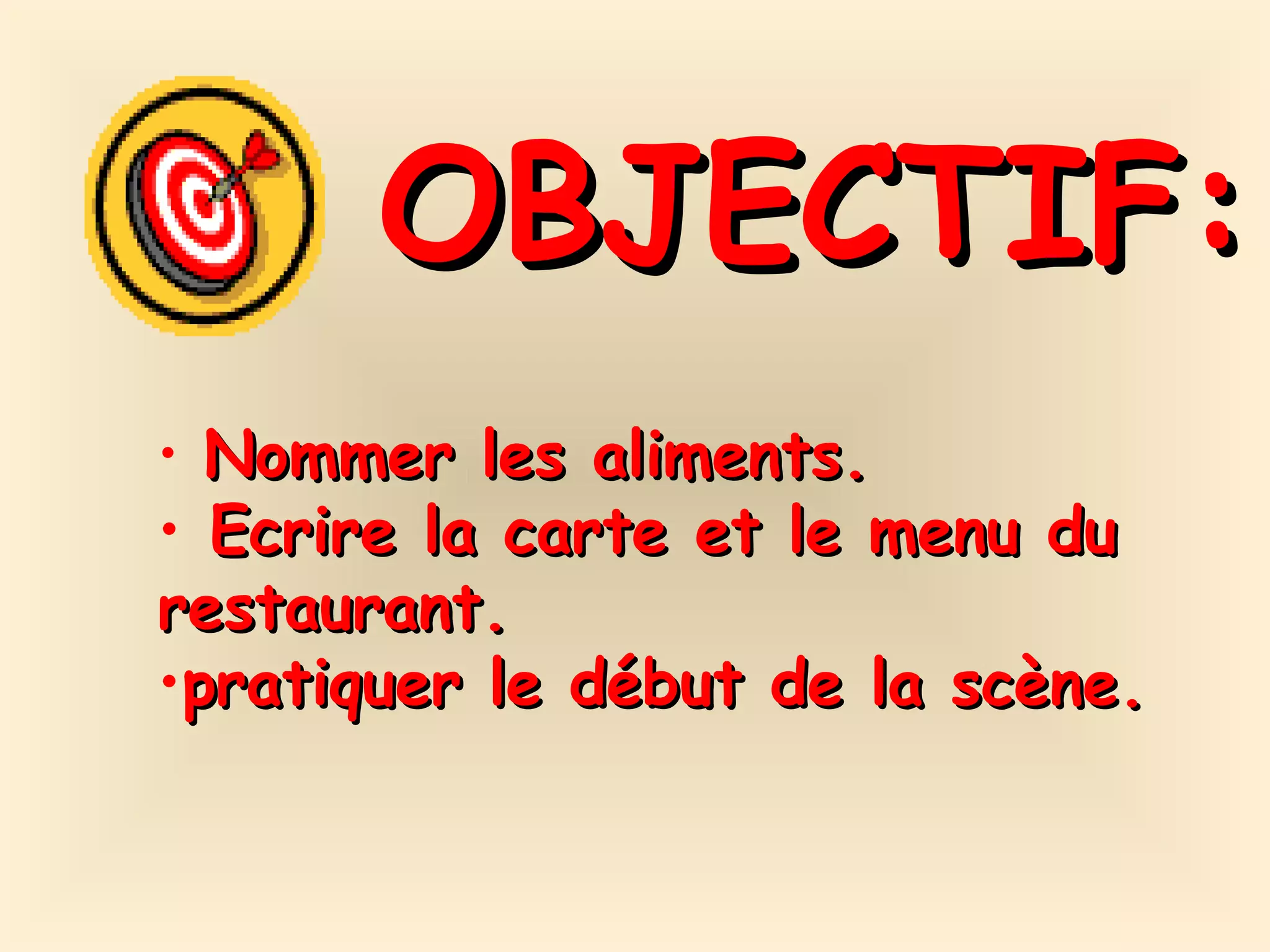 Le document traite de la création d'un menu de restaurant comprenant diverses catégories d'aliments telles que les entrées, les plats principaux et les desserts. Il inclut également des instructions sur la façon de commencer une scène de restaurant. Enfin, il propose des exemples d'aliments à inclure dans le menu.