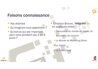 Le document présente un programme de formation sur les évolutions du marketing et de la communication dans un monde digitalisé, abordant des sujets tels que la transformation digitale des entreprises, l'impact des nouvelles technologies sur le comportement des consommateurs et des modèles de communication cross-média. Il souligne l'importance de comprendre les besoins des clients et d'utiliser des données pour personnaliser l'expérience, tout en prenant en considération les défis associés à la digitalisation. Enfin, il traite des outils et supports disponibles pour une communication efficace, y compris l'utilisation des QR codes et de la réalité augmentée.