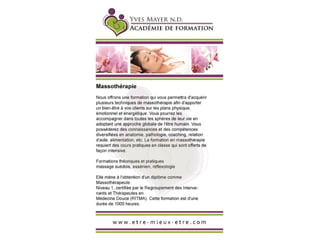 Le centre de formation Yves Mayer a aidé des centaines d'étudiants à obtenir des diplômes professionnels en santé naturelle, leur permettant de réaliser leurs ambitions de carrière. L'école met l'accent sur le bien-être de ses futurs thérapeutes pour qu'ils puissent enrichir la vie de leurs clients. Les cours sont accessibles à distance et s'adressent aussi bien aux débutants qu'aux professionnels en activité.