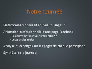 Le document présente des stratégies pour animer efficacement une page Facebook d'entreprise, en se concentrant sur l'utilisation des nouvelles technologies et des réseaux sociaux. Il souligne l'importance de définir des objectifs clairs, d'engager la communauté via des contenus authentiques et d'interagir avec d'autres pages. Des statistiques sur la mobilité des adultes québécois et l'utilisation des réseaux sociaux sont également fournies pour soutenir ces stratégies.