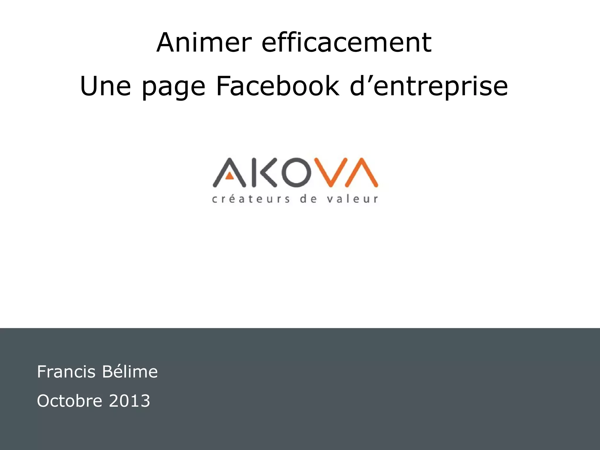 Le document présente des stratégies pour animer efficacement une page Facebook d’entreprise, en se concentrant sur l'importance des nouvelles technologies et des comportements des utilisateurs, notamment au Québec. Il aborde la définition d'objectifs, l'engagement de la communauté et l'utilisation de techniques de storytelling pour interagir avec les clients. Enfin, il souligne la nécessité de partager des nouvelles pertinentes sur l'entreprise et ses partenaires.