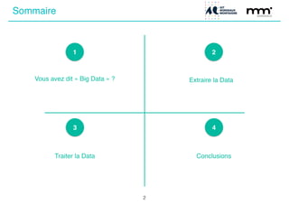 Le document présente une journée de formation sur le big data, expliquant les concepts, les enjeux et les différentes méthodes de traitement des données. Il aborde les types de données, leur volume croissant, ainsi que les techniques d'extraction comme le crawling et le scraping. La conclusion souligne l'importance de l'éthique dans la collecte et le traitement des données personnelles.