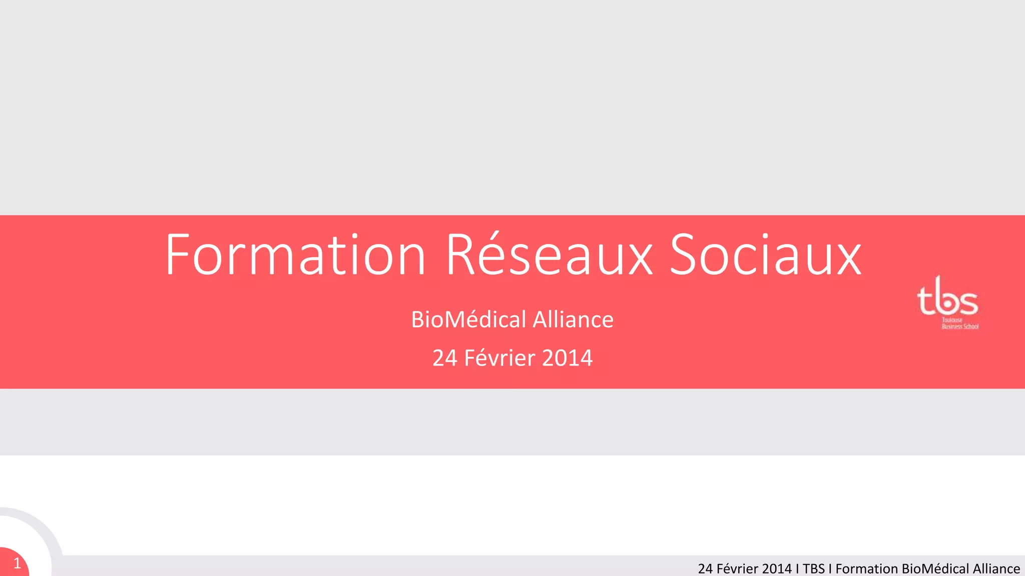 La formation de l'alliance biomédicale sur les réseaux sociaux, tenue le 24 février 2014, vise à enseigner l'utilisation efficace des réseaux sociaux pour atteindre des objectifs de communication et de développement d'une image d'entreprise. Elle couvre des plateformes clés telles que Facebook, Google+, Twitter, YouTube, LinkedIn, Viadeo, Slideshare et Instagram, en mettant en avant leur impact croissant dans le secteur B2B et en détaillant leurs spécificités, modèles économiques et intérêts pour les marques. L'objectif est de préparer les participants à intégrer ces outils dans leur stratégie de communication globale.